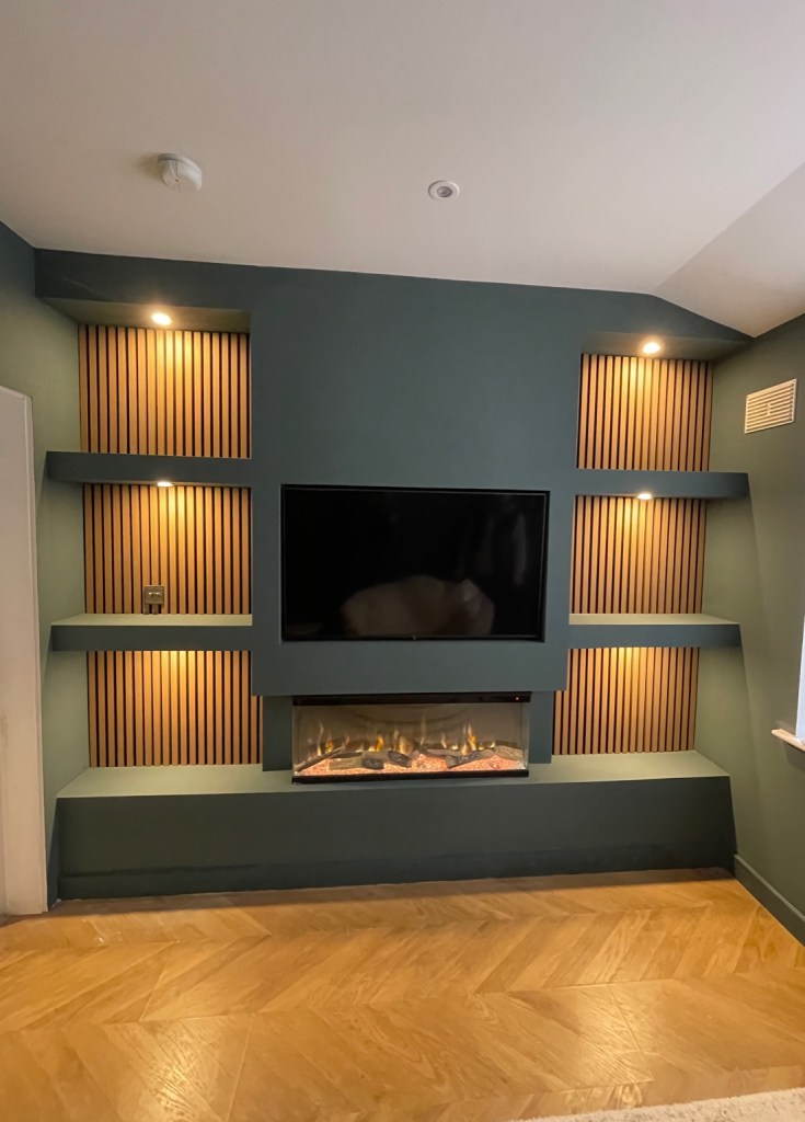We offer custom feature wall designs, including cut-out areas for TVs and shelves, as well as digital fireplaces. Our expert craftsmanship ensures a seamless integration, transforming your space into a cosy and inviting environment.